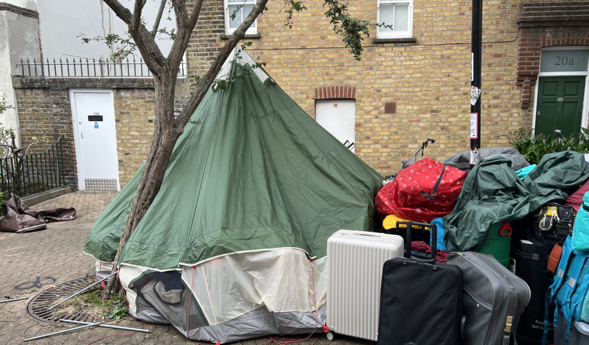 Photos taken by Putney.News yesterday showed multiple tents, tarpaulins, and piles of personal possessions covering large parts of the pavement on Olivette Street, with at least one visibly agitated man shouting at passers-by. The impromptu encampment sits just metres from residential front doors and children’s play areas.