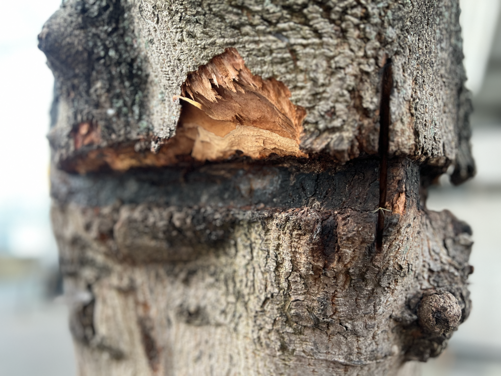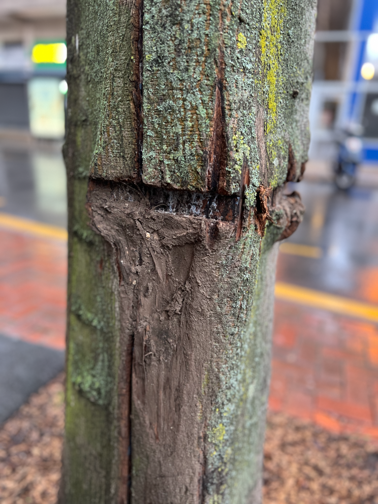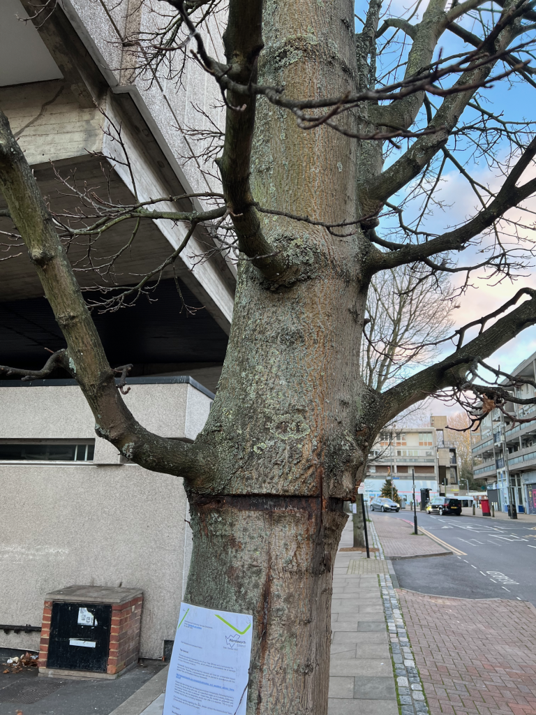 It is not currently clear whether the council still intends to remove the trees. The damage caused by the railings (which should have been removed or at least expanded outwards years ago and have served as somewhat of a tourniquet, damaging the cambium layer) is very visible but doesn’t appear to have compromised the trees themselves. Neither tree has been fully “girdled” – compromised all the way around the trunk – which means they are likely to survive.