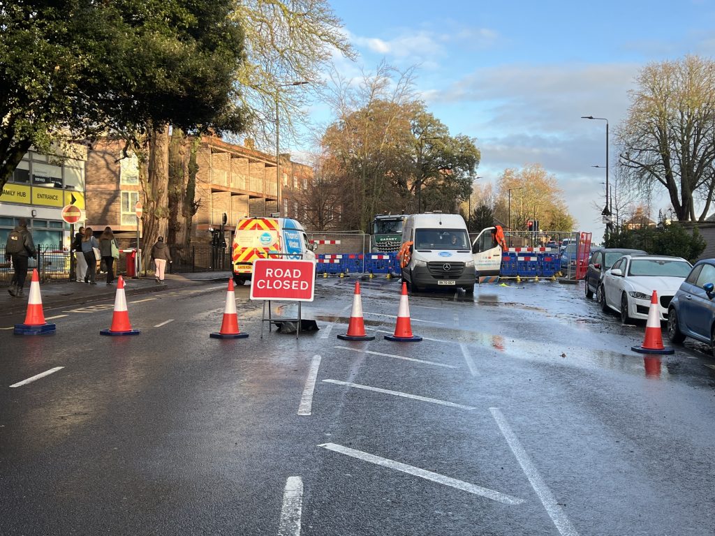 The road is closed in both directions near the junction with Clarence Lane, where Thames Water contractors are working to repair a large hole that has flooded the carriageway. Water was still pooling across the road surface on Wednesday morning despite excavation work beginning overnight.